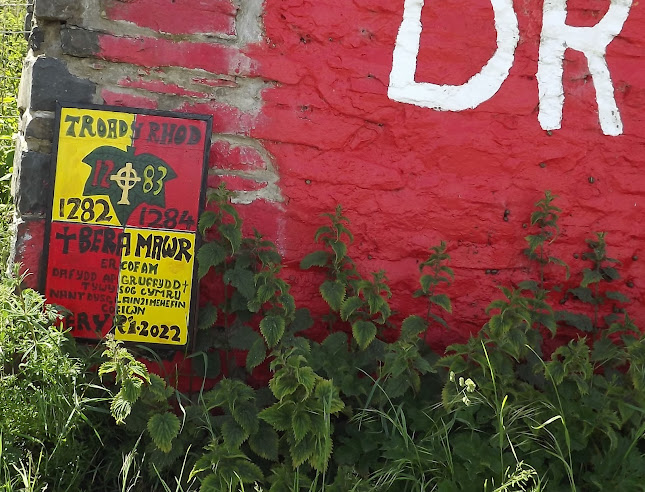 HALF WAY THERE AND AT A COMMEMORATIVE SITE OF A WELL KNOWN SLICE OF WELSH HISTORY WE MAKE THE POINT HERE'S SOME REALLY IMPORTANT WELSH HISTORY MOST NATIONALISTS KNOW NOTHING ABOUT - THECAPTURE AND LATER DEATH OF DAFYDD THE LAST PRINCE OF GWYNEDD AND LOSS OF CYMRIC INDEPENDENCE AND CONTEMPORARY NATIONALISTS DON'T GIVE A DAMN - WHY?